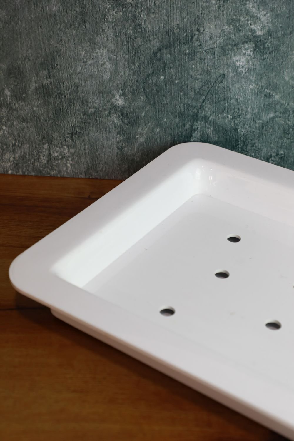 Toplam 12 adet su tahliye deliği, özellikle karpuz, kavun gibi sulu meyvelerin su birikmeden sergilenmesini sağlar. Estetik görünümünün yanı sıra işlevselliği ile hem gıda sunumlarını kolaylaştırır hem de masa ve tezgâh düzenini korur.