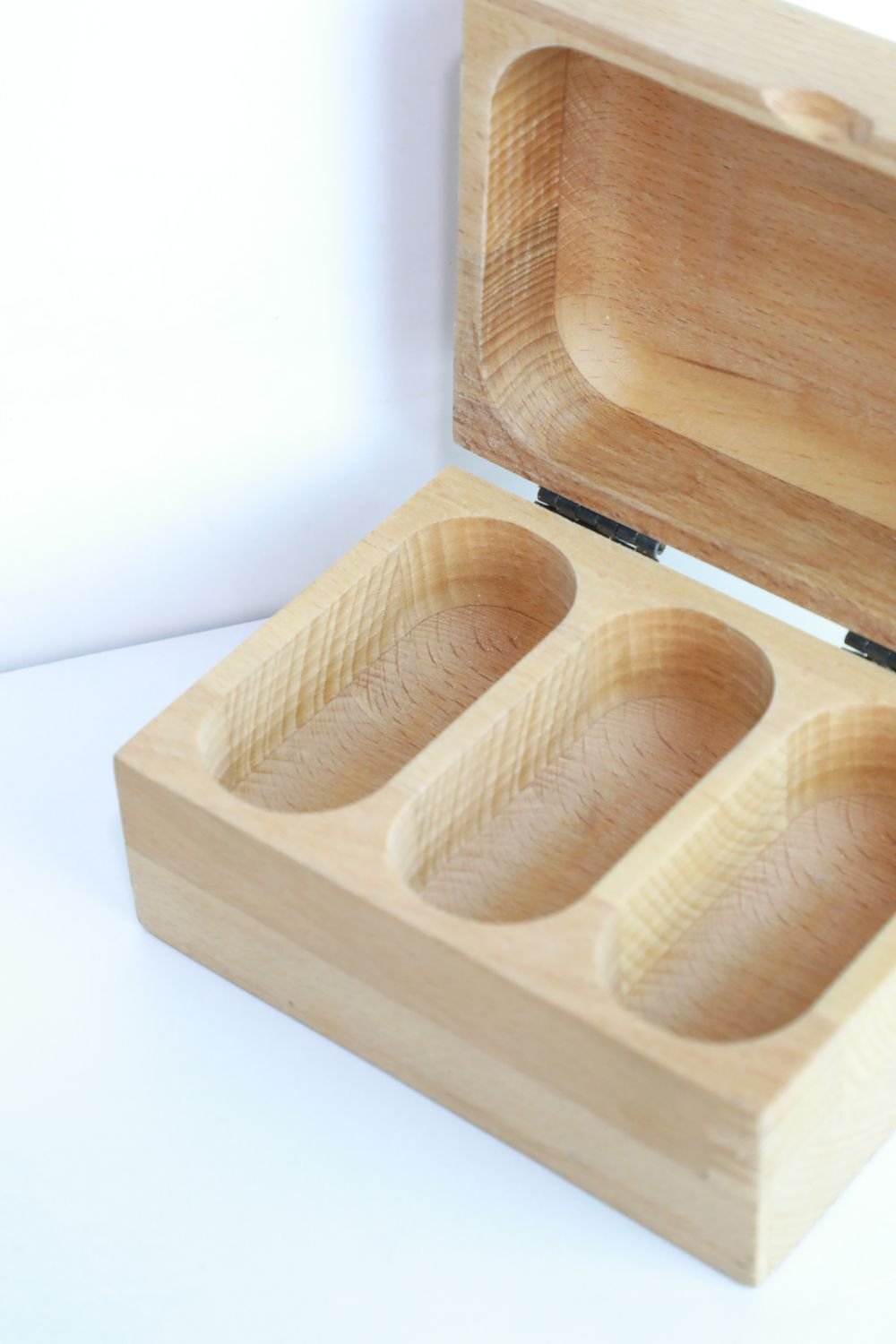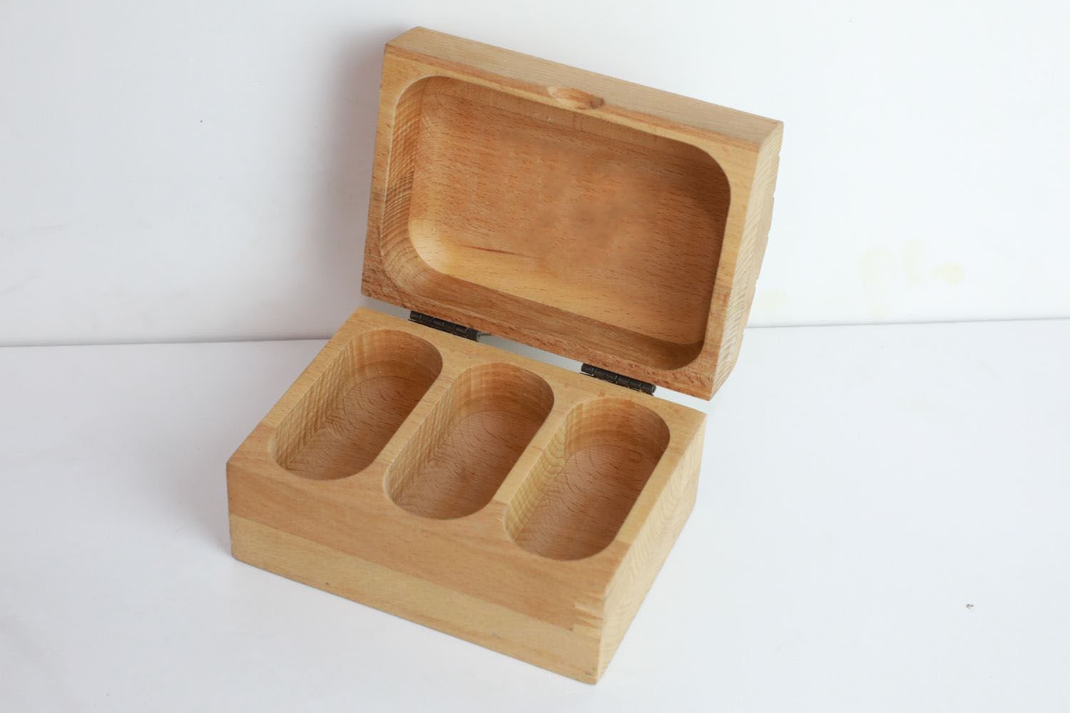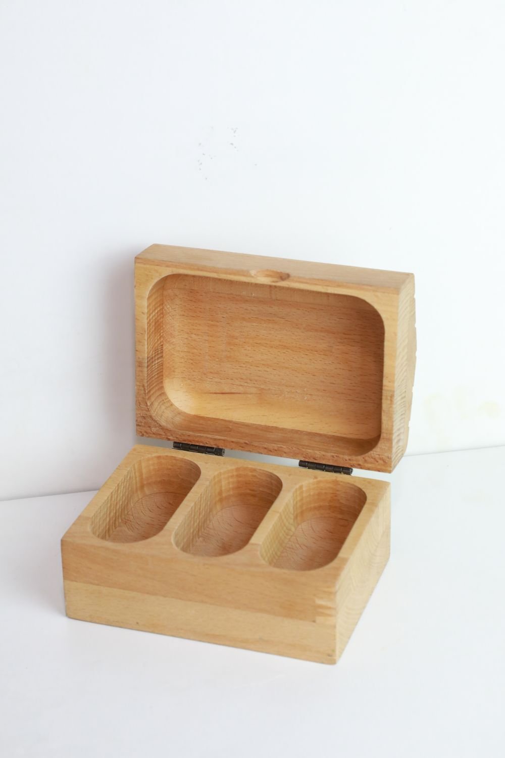 Teak Yağlı Kapaklı Ahşap 3 Gözlü + Atık Yuvalı Çerezlik – Kayın (Gürgen) – 15x10 cm | Yükseklik: 9,5 cm