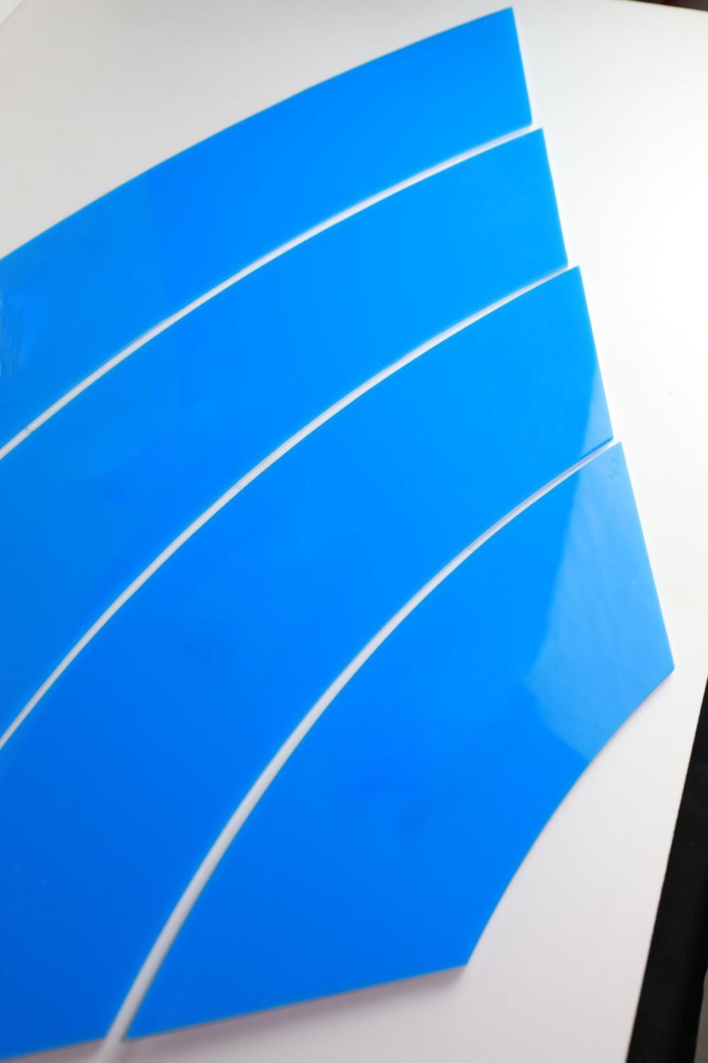 12x80 cm Yay Şeklinde Akrilik Sunum Tepsisi | Beyaz & Mavi | Çift Katlı | Çift Taraflı Kullanım – Masa Sunumu, Açık Büfe ve Standlar İçin Özel Tasarım