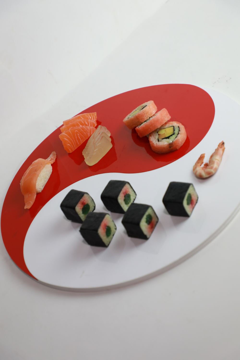 Tek taraflı kullanım için tasarlanmış bu sunum tepsisi, üst yüzeyinde zarif bir kırmızı & beyaz Yin Yang desenine sahiptir.